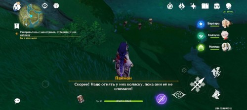 Осмотрите вмятины на дороге. Коляска лежит справа от тропинки, окруженная хиличурлами. Победите монстров и заберите коляску.