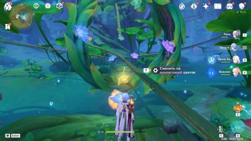 Подойдите к сине-желтому бутону и выберите опцию «Сменить на фиолетовый цветок». Когда дорога перестроится, сядьте в таратайку и начните двигаться на ней вперед.