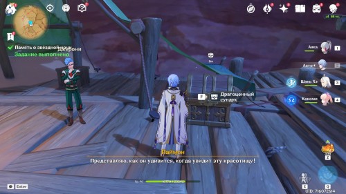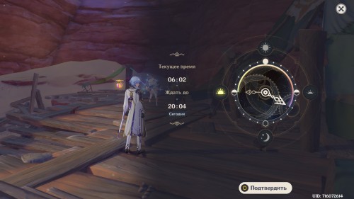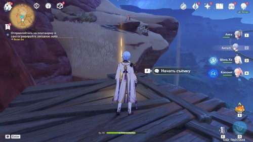 Если вы прибыли к персонажу в дневное время суток, то первым делом вам необходимо будет перевести время на 19:00-5:00. Сделать это можно при помощи часов в меню Паймон. Далее поднимитесь на ближайшую деревянную площадку и встаньте в месте, на которое указывает маркер.