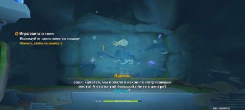 Теперь поднимитесь по лестнице. Паймон заметит большую плиту с фреской, после чего и начнется квест.