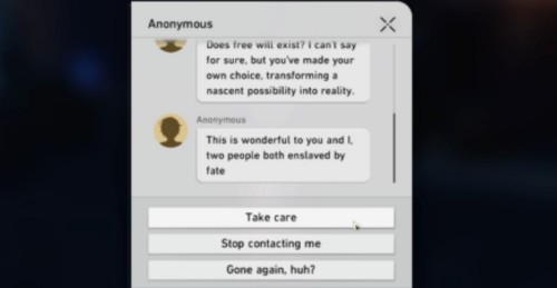 На следующий реальный день после сброса сервера вы получите еще одно сообщение от Кафки на свой телефон. В нем она снова заговорит о свободе воли и нашем выборе. Можете ответить ей как хотите, так как это уже ни на что не повлияет.