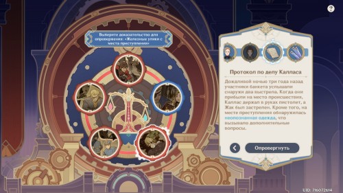 Вам не удастся до конца проанализировать улики, так как прибежит Тьерри и расскажет, что в оперном театре начали судить Тарталью. Вы решите разделиться: Навия постарается задержать суд, а Путешественник тем временем попробует отыскать новые доказательства. После беседы вы получите заметку «Анализ подозреваемых».