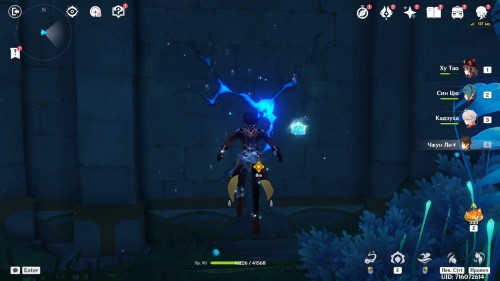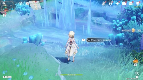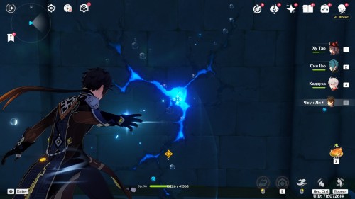 Теперь поверните налево и подплывите к стене с синей трещиной. Зажмите клавишу «E» (элементальное умение), направьте прицел в стену и отпустите кнопку для совершения удара. В результате вы создадите новый проход.