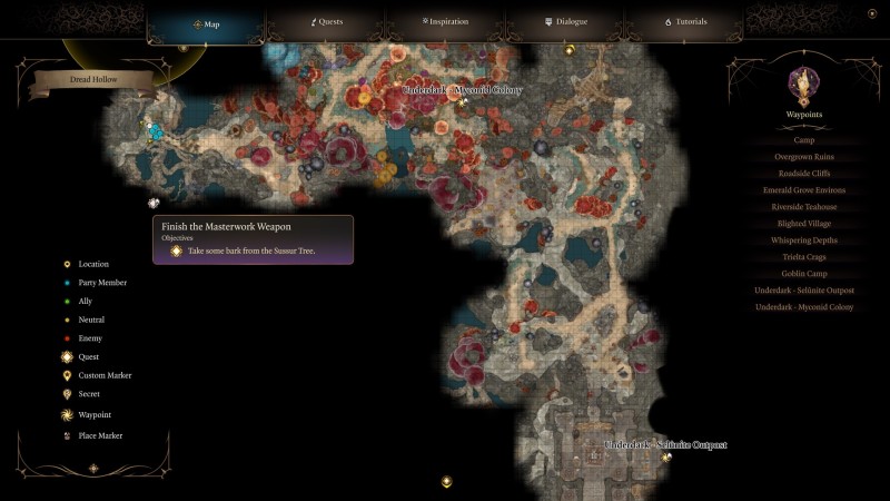 Дерево суссар находится на западе локации и путь к нему будет отличаться, в зависимости от места, через которое вы проникли в Подземье. Его местоположение (X: -17, Y: -143) мы подсветили на карте, вам остается только добраться туда.