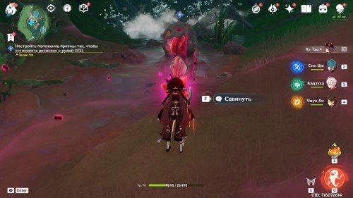 Далее ударьте по призме простой атакой, создав заряд энергии, который уничтожит руду, позволив собрать ее (вы получите алый камень). Рядом, кстати, можно победить врагов для открытия богатого сундука.