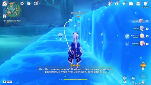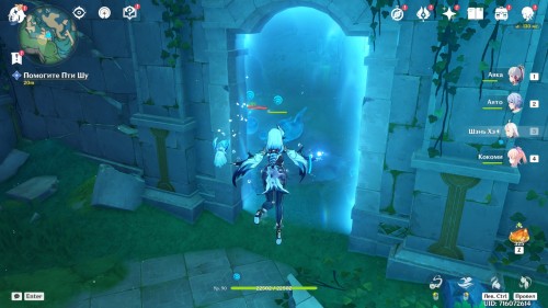 Плывите вперед и активируйте телепорт слева. Когда подплывете к квестовому маркеру, начнется новый диалог. После завершения разговора двигайтесь к проходу в каменном сооружении с левой стороны и пройдите через синий барьер.