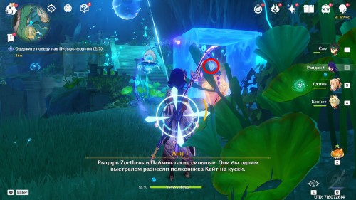 Теперь нужно помочь Алу. Пройдите немного вперед, и в вас тут же полетит снаряд пузырь-форта. Стукните по Гидро кристаллу впереди, чтобы создать мост с барьерами, ведущий на другой берег. Там разберитесь с врагами и спасите очередного члена отряда Нарциссенкрейца.