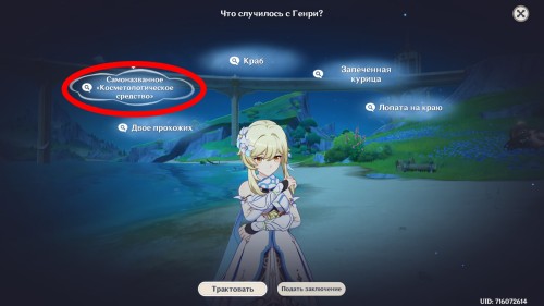 - Нажмите на улику «Самоназванное косметологическое средство», а потом выберите опцию «трактовать» для появления подсказки «Крик посторонним» (первый скриншот).