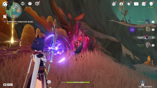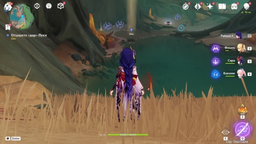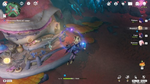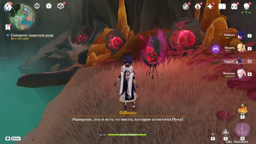 Телепортируйтесь в деревню Меруси и нырните в пруд, отмеченный указателем. Проплывите через дыру, чтобы попасть в подводную часть поселения. Здесь вы обнаружите Пуки – поболтайте с ней и передайте найденный «дар». Паймон предложит отнести найденную руду специалистам из города.