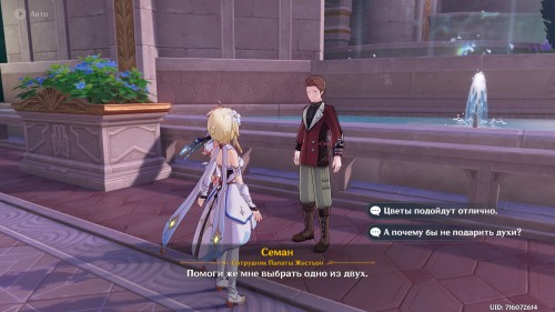 Когда это наконец-то произойдет, переместитесь к Фонтану Люсин и поговорите с Семаном, стоящим слева от этого объекта. Он расскажет вам, что хочет поднять настроение своей подруге, поэтому попросит вас помочь ему с выбором подарка – от вашего ответа будут зависеть дальнейшие события (однако на вашу награду это никак не повлияет).