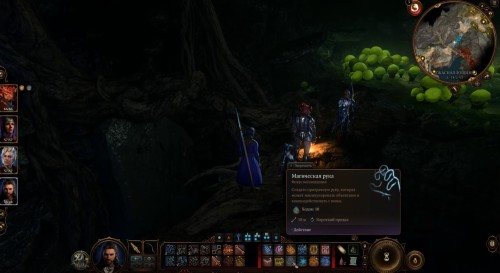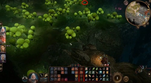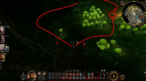 При отсутствии свитка вам предстоит отыскать рюкзак грибника. Он находится чуть ниже факела, лежащего возле скалы. Если у вас есть Гейл в команде или вы сами волшебник, то призовите Магическую руку, а затем подлетите ею до мешка (грибы не будут реагировать на нее). Далее начните бросать сумку в сторону Баэлена – смотрите не заденьте растения. Как только рюкзак окажется возле грибника, он сможет воспользоваться заклинанием.