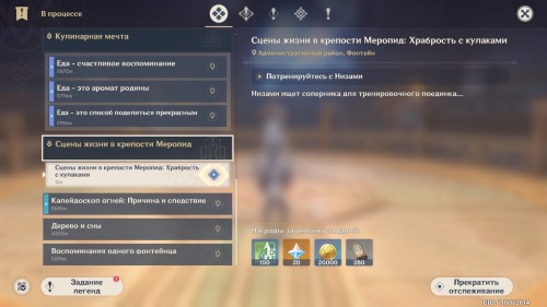 Вам нужно будет пообщаться с Низами, который находится в поисках оппонента для проведения тренировочного боя. Согласитесь провести поединок и победите соперника. Затем снова побеседуйте с Низами. В награду вы получите 150 очков приключений, 20 примогемов, 20 тысяч моры и 280 премиальных купонов. Подробное прохождение квеста представлено в отдельном гайде.