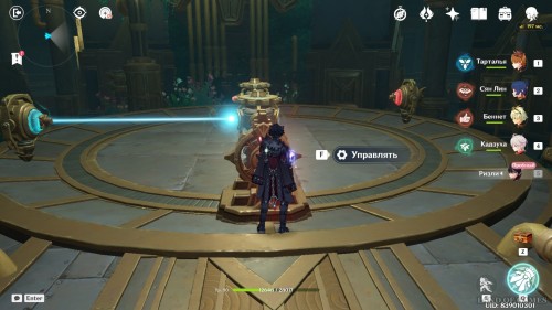 В итоге вы попадете в комнату с новой головоломкой. Сначала снимите ограничитель с красного механизма, окруженного фиолетовой клеткой. Затем подойдите к управляющему колесу. Дважды поверните его. Тут же начнет подниматься вода, которая доставит вас наверх.