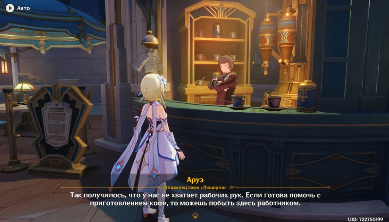 Место проведения задания – кофейня «Люцерна» в центральной части города. Ближе и легче всего можно добраться от телепорта перед «Дебор Отелем», но вариант от статуи Архонта тоже подойдет. Вступите в диалог с Аруэ, хозяином заведения, и узнайте о том, что мужчине требуется помощь.