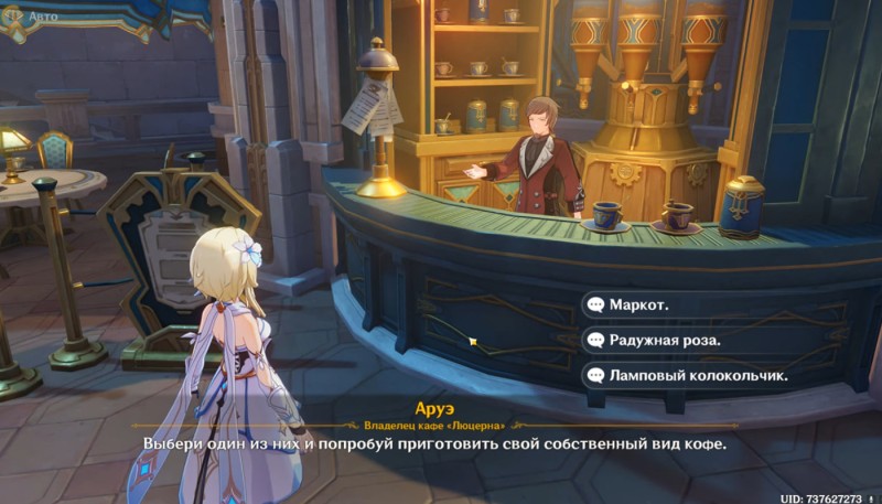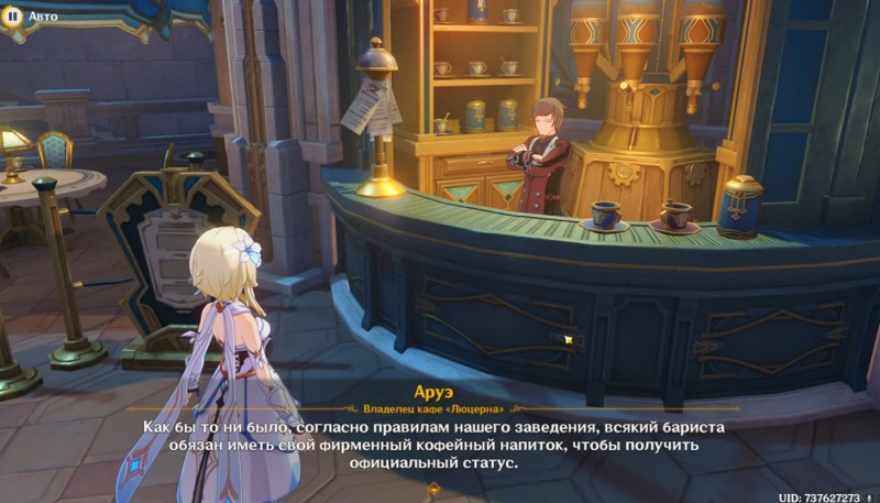 После первого разговора снова побеседуйте с Аруэ и (если готовы выполнить его просьбу) кликайте на вариант «Давай начнем». Мужчина пустит вас за стойку к кофемашине и можно будет приступить к работе и выбору компонентов напитка.