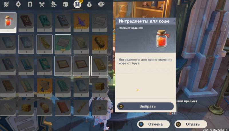 В ходе беседы мужчина сообщит три особых ингредиента для вашего напитка: маркот, радужную розу и ламповый колокольчик. Выберите любой компонент, а после разговора кликните «Добавить ингредиент в кофе»: в вашем багаже появится отмеченный ресурс, который нужно отдать хозяину.
