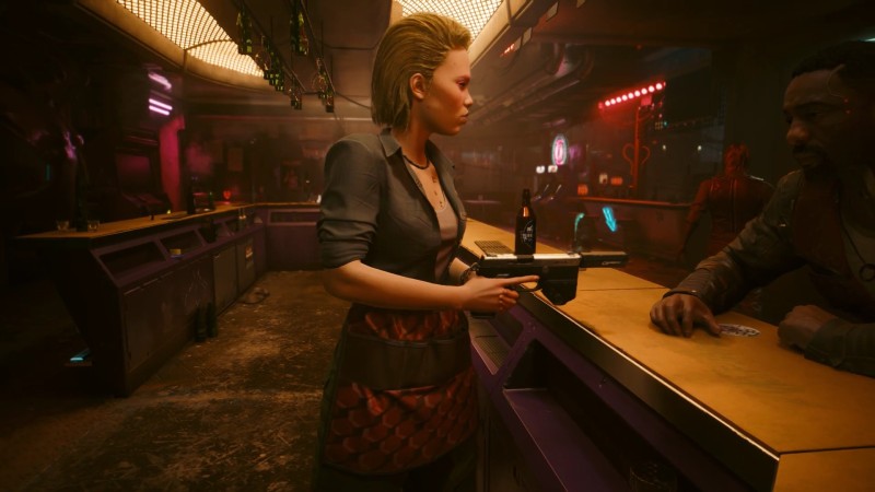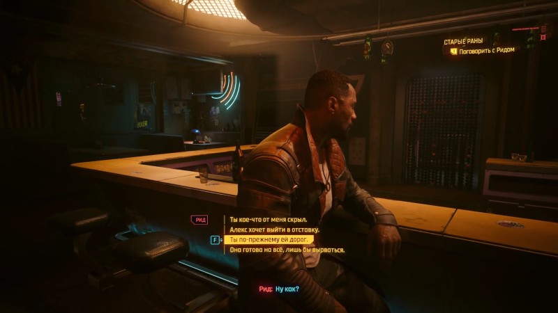 Вход в бар расположен на втором этаже и после того, как войдете, вы можете сразу садиться у барной стойки. Рид предупредит о возможном негативе со стороны бывшей подчиненной, но в любом случае остается просто ждать. Реакция девушки за стойкой на вошедшего Рида будет предельно понятной – вы можете разоружить ее или показать монету, в результате все равно удастся поговорить.