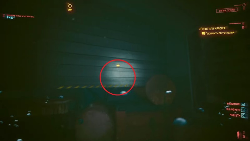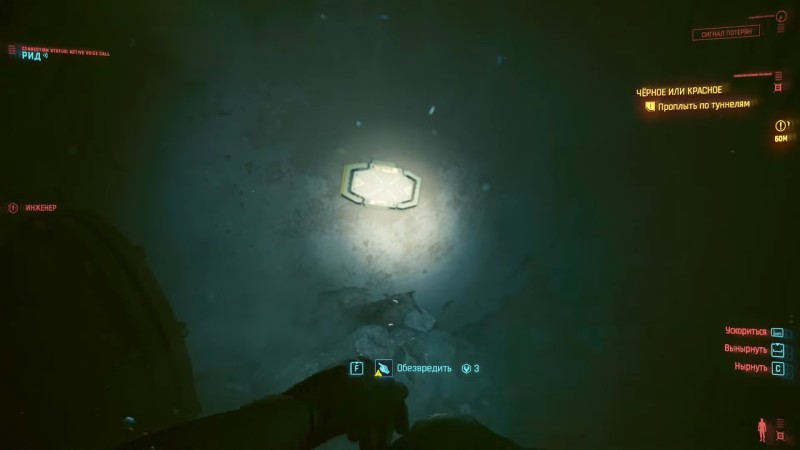 Погружайтесь в воду и плывите, придерживаясь левой стороны туннеля. Скоро вы упретесь в круглую решетку, которую потребуется открыть и продолжить движение в направлении красного свечения – это мина, ее будет лучше обезвредить.