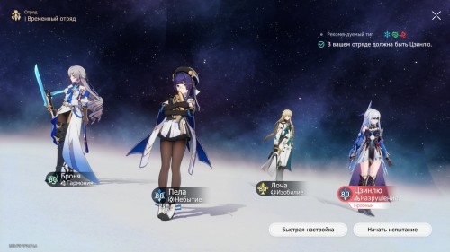 После передачи послания состоится небольшой диалог. По его окончании начнется разведывательное испытание. Во время его прохождения в вашем отряде обязательно должна быть Цзинлю. Если у вас нет героини, то вам будет предоставлен пробный ее вариант. Остальную команду мы рекомендуем собирать из персонажей, обладающих ледяной, воздушной и огненной стихиями. Так вы сможете быстрее пробивать уязвимости встречающихся врагов.