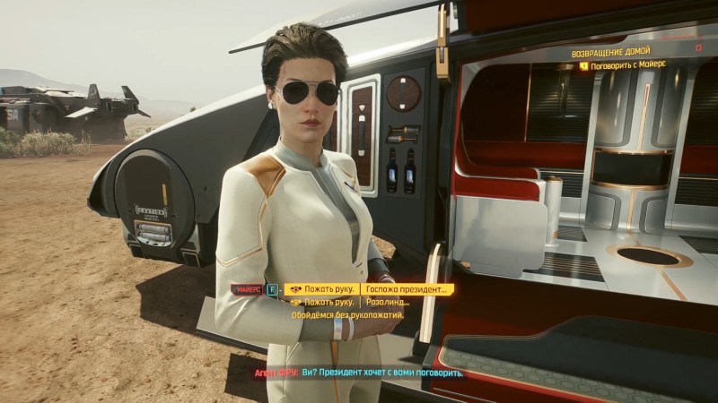 После того как вы припаркуете машину у геликоптера, состоится диалог с Майерс, которая либо поблагодарит Ви за успешное выполнение задания и пообещает связаться позже для обсуждения исцеления, либо уволит со службы.