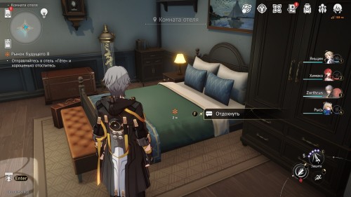 Вновь пообщайтесь с Топаз и Броней. Затем можете поговорить с Март 7 и Химеко или сразу отправиться в отель «Гете», расположенный в Административном районе. Пройдите в свой номер и ложитесь спать.