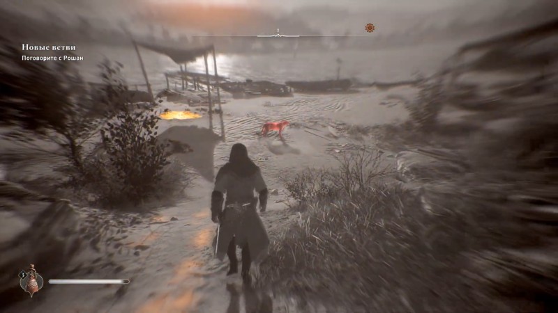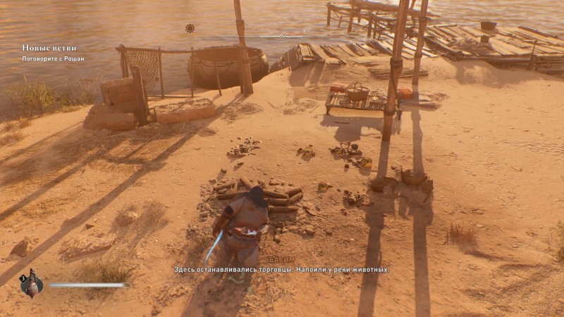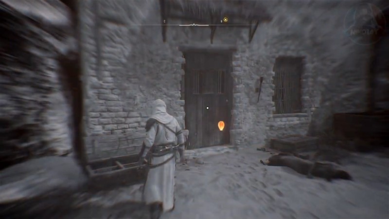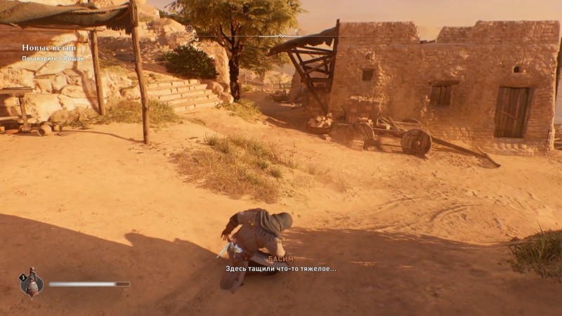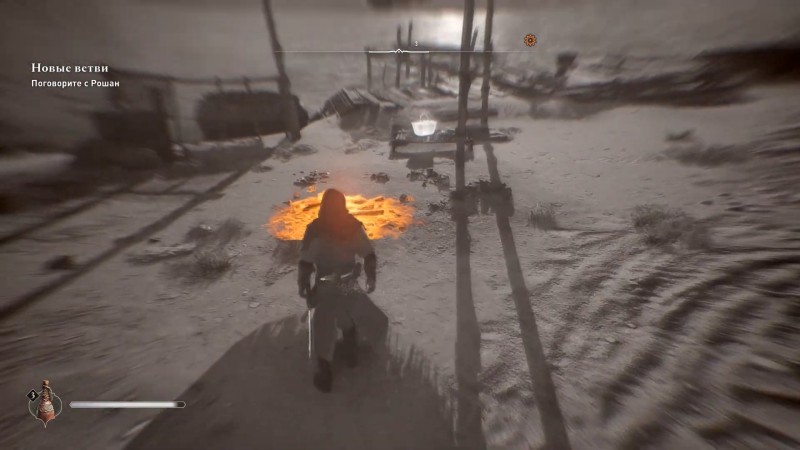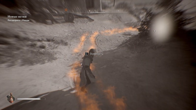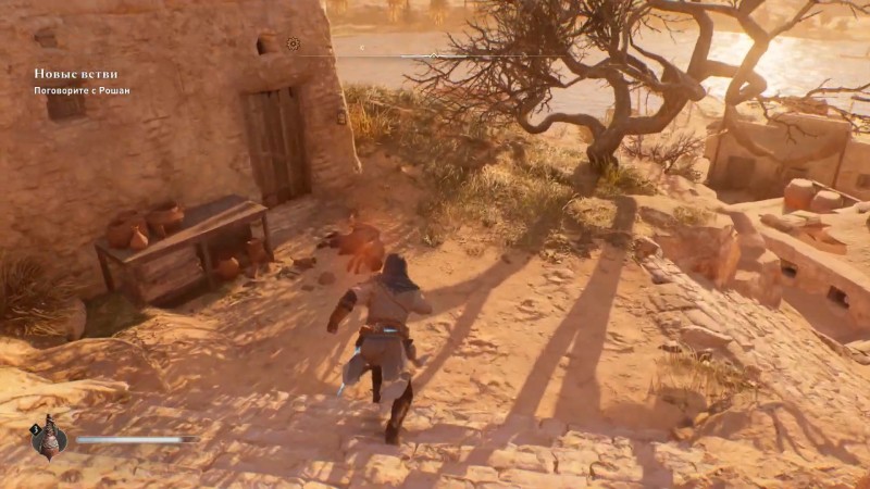 Далее необходимо спуститься по лестнице слева от того места, где была найдена монета – напротив дома с трупом из первой подсказки. С помощью орлиного зрения вы найдете пятую подсказку: следы на песке.