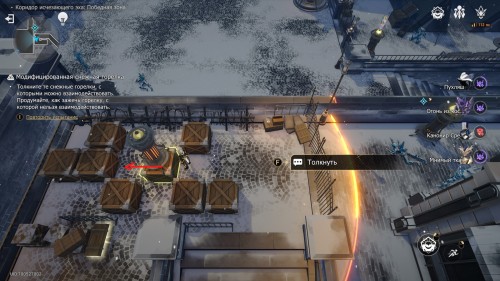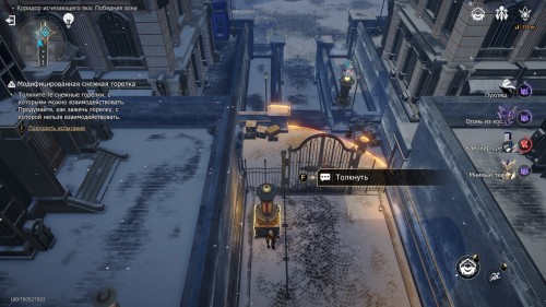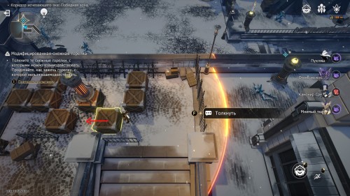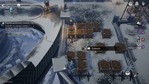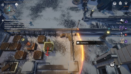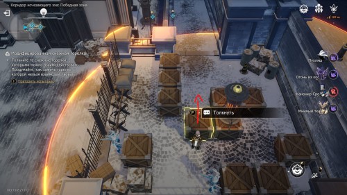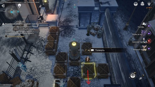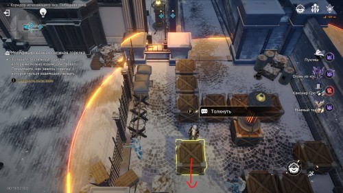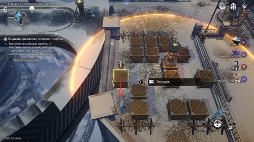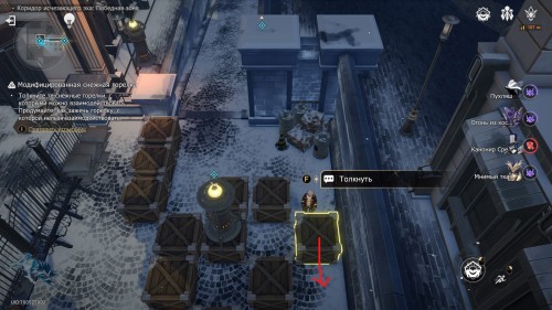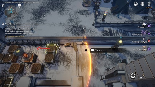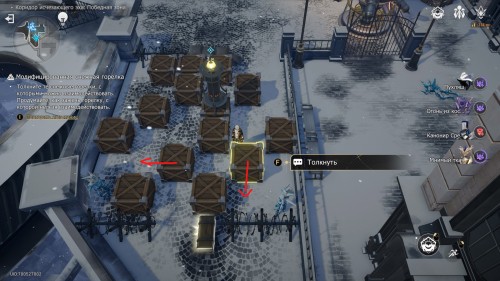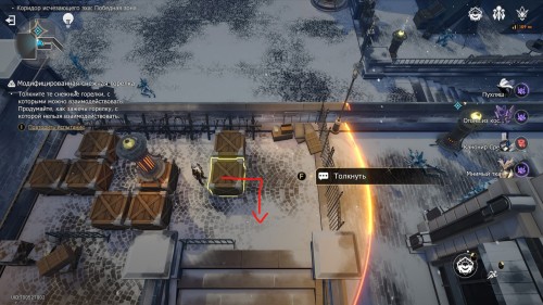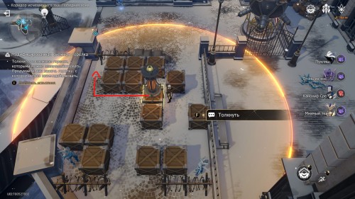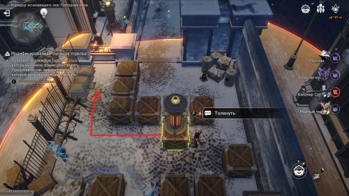 Теперь пройдите к коробке слева от горелки и подвиньте ее наверх. Самый дальний левый ящик нужно толкнуть вниз. Далее встаньте справа от устройства и начните двигать его к ограждению, как продемонстрировано на скриншоте ниже.