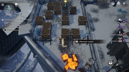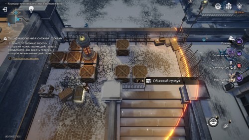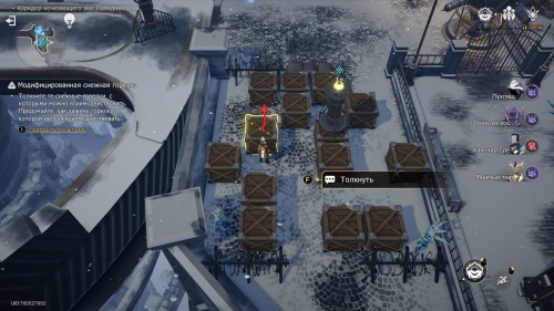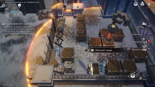 Далее сбросьте головоломку, нажав на надпись «Повторить испытание», расположенную чуть ниже описания текущей задачи. Собранный сундук не обновится, поэтому теперь можно заняться непосредственно горелкой. Подвиньте нижний ящик в первом ряду налево. Затем толкните среднюю коробку один раз вправо и один раз вниз. Подойдите к устройству слева и начните толкать его к решетке справа.