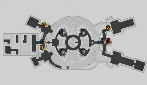 Теперь телепортируйтесь на второй этаж и двигайтесь в его северо-восточную область. В первой комнате вы увидите площадку с журавликами, однако одного не хватает. Войдите во второе помещение и решите головоломку с платформами – правильный маршрут показан на скриншоте ниже.