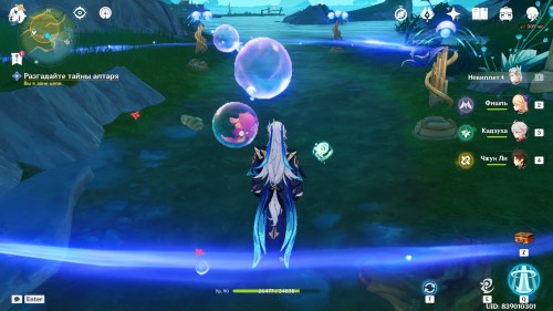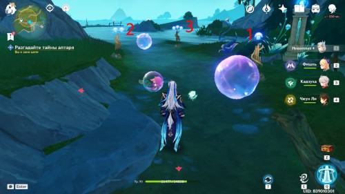 После этого перед вами появятся два пузыря. С помощью умения осьминога переместите их ближе к тростниковым дудочкам, стоящим в русле ручья. В итоге трубочки должны стоять в области действия сфер. По очереди лопните их: сначала расположенную рядом с инструментом с одним символом, а затем другую, висящую около пары дудочек с двумя знаками. После этого к алтарю полетит первая капля росы.