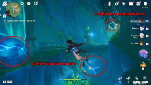 Плывите вниз в открытый проход. В следующем затопленном помещении сверните вправо. Плывите дальше, пока не попадете в пространство с ксенохромным бронекрабом и тремя булыжниками с синими трещинами. Заберите способность у морского существа и разрушьте все три камня (показаны на картинках ниже).