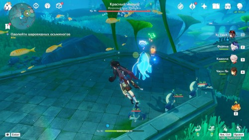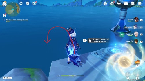 Переместитесь к подводному телепорту в Салосском морском плато и плывите в сторону каменного строения. Заберите по пути способность пухленя, чтобы потом сразиться с шаровидными осьминогами, которые появятся перед вами. Теперь можете заплыть в строение. Если оно закрыто красным барьером, то прочтите наше руководство о том, как его снять.