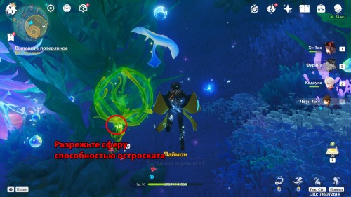Теперь заберите навык у ксенохромного остроската, плавающего чуть восточнее от вашего текущего местоположения, и выстрелите клинком (клавиша «Е») в зеленую сферу, чтобы уничтожить водоросли и освободить треногу.