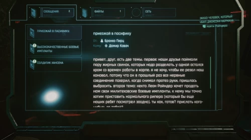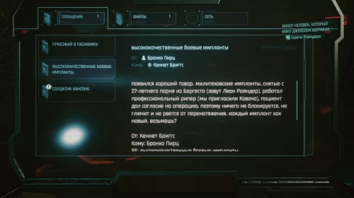Закончите диалог с Райндером и заберите жетон. Бывший наемник на время исчезнет из жизни Найт-Сити. Через несколько дней он пришлет Ви сообщение, что хочет помочь семьям, которые пострадали от его злодеяния. Независимо от выбора отговорить его или согласиться с ним, Райндер все равно сделает так, как считает нужным.