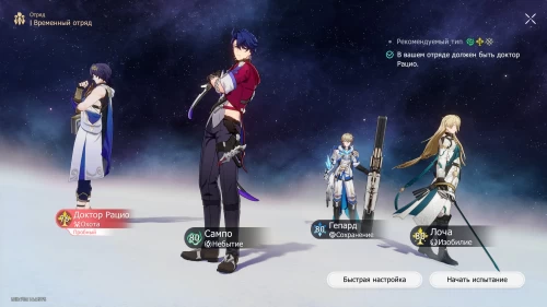 В этом испытании вам предстоит сразиться с двумя элитными противниками: Оборотнем и Подавителем. В вашем отряде обязательно должен присутствовать доктор Рацио, который занимает роль дамагера. Можете взять ему в поддержку еще одного основного или второстепенного ДД, относящегося к мнимому или ветряному типам урона.