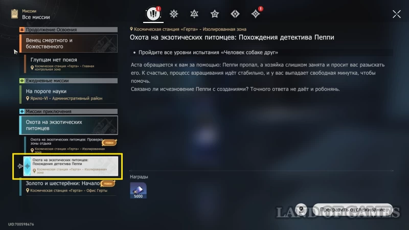 Взращивая питомцев, вы прокачиваете Уровень исследования: достигните четвертого уровня и пройдите миссию приключений «Охота на экзотических питомцев: Забота». Тогда в списке заданий появится квест из этой же серии, «Похождения детектива Пеппи» – с него начинается путь к открытию Боевой разведки «Человек собаке друг».