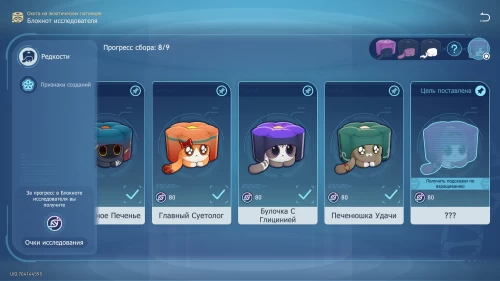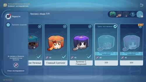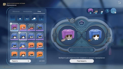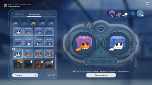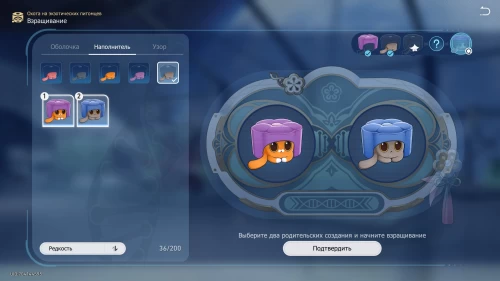 Снова взаимодействуйте с печью жизни, перейдите в Блокнот исследователя и задайте себе новую цель. Далее выберите родителей, показанных на втором скриншоте ниже, для создания промежуточного питомца с фиолетовой оболочкой и кофейным наполнителем.