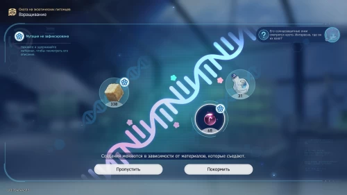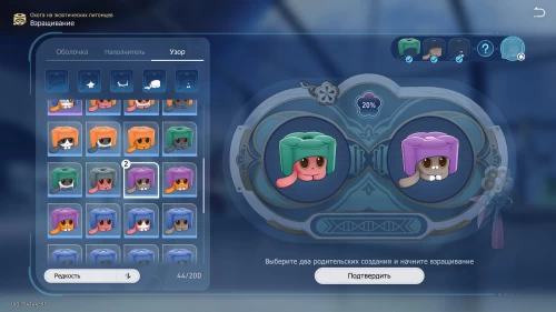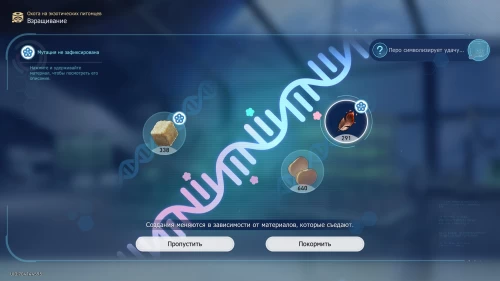 Теперь возьмите созданное существо и добавьте к нему второго родителя с белой мордочкой и начните взращивание, пока не произойдет мутация. Скормите питомцу «Мнимые частицы». Далее дождитесь особой мутации и вновь выберите «Мнимые частицы» для получения Булочки с глицинией.