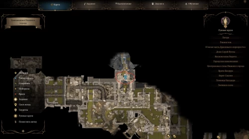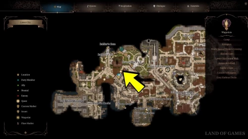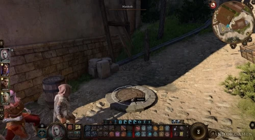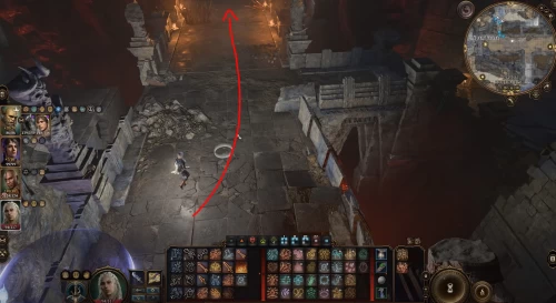 Примечание: Если вы не хотите допустить смерти пса, то, узнав, что в лагерь пробралась Орин, ни в коем случае не отдыхайте в нем, а сразу же отправляйтесь во Врата Балдура и войдите в канализацию. Для этого можете воспользоваться люком по координатам Х: -160, Y: -62. Затем пройдите в место (X:-141, Y:923), обведенное на последнем скриншоте, чтобы триггернуть сцену похищения без убийства.