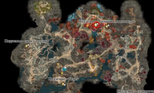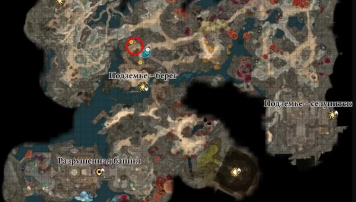Для попадания в эту локацию вам необходимо будет сесть в лодку, пришвартованную в Обветшалой деревне, неподалеку от телепорта «Подземье – берег». Если вы не прошли задание «Найти пропавшие сапоги», «Отомстить за круг Глота» или «Победить захватчиков-двергаров», то по дороге вас остановит Гех Уголек и его банда (расположение можно увидеть выше).