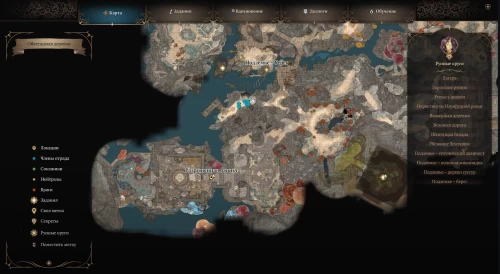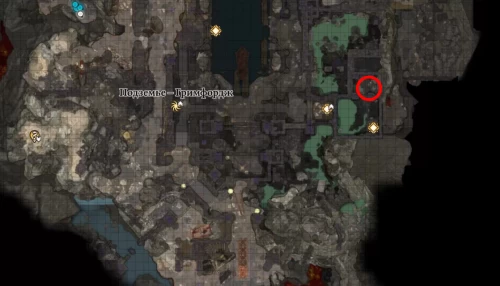 Для нахождения гномихи переместитесь к путевой точке «Подземье – Гримфордж», а затем начните двигаться на восток, спустившись по лестнице. На карте выше показан весь маршрут. Возле лесенки, ведущей наверх, сверните влево к двум двергарам, бросающим трупы в воду (Х: -608, Y: 407). Можете попробовать расправиться с ними скрытно или убедить уйти, пройдя проверку на Внимание (10) и Обман (10). Не забудьте потом осмотреть трупы, чтобы найти Каллардуранский идол (кольцо на Невидимость).