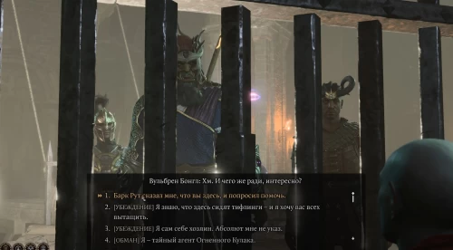 Теперь вступите в диалог с Лией. В некоторых случаях она может с недоверием отнестись к главному герою, посчитав его последователем Абсолют (если вы до этого не отослали охранника). Можете либо пройти проверку на Убеждение, либо упомянуть знакомые ей имена, например, Ролана. После этого тифлинги скажут, что гномы в соседней камере что-то задумали, поэтому посоветует пообщаться с ними.
