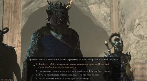 Теперь разделите отряд, дайте двум воинам дробящее оружие и одного поставьте возле стены к камере гномов, а другого – стены к камере тифлингов. Разрушьте сначала стену у тифлингов, а потом у гномов и бегите вместе с ними к лодке. Сразу же начнется диалог, в котором следует выбрать первый ответ, то есть уплыть вместе с пленниками в «Последний свет» (или можете попробовать остаться, посоветовав заключенным отправиться в таверну).