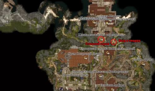 - Можно также просто пробить решетку дробящим оружием и войти внутрь. Если вас заметит стальной стражник, то вы можете убедить его, что вам разрешено здесь находиться, пройдя проверку на Обман, Запугивание или Убеждение (класс сложности 22). В результате вы сможете спокойно перемещаться по территории вокруг фабрики – советуем пройти к платформе (X: -276, Y: -175) на южной стороне здания и взаимодействовать с рычагом, чтобы открыть вход в литейную.