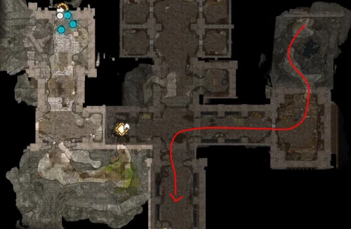Обойдите скалу, и вскоре вы заметите трещину в стене форта (X: 43, Y: 180). Взаимодействуйте с ней, чтобы попасть внутрь тюрьмы. Войдя в нее, вы тут же завершите задание по поиску пути в замок.