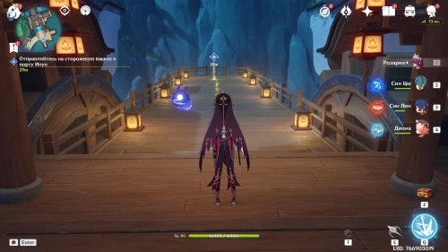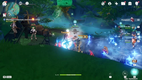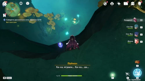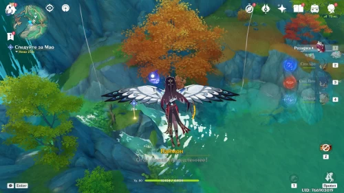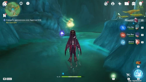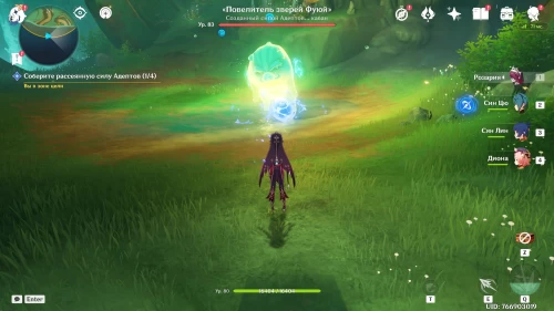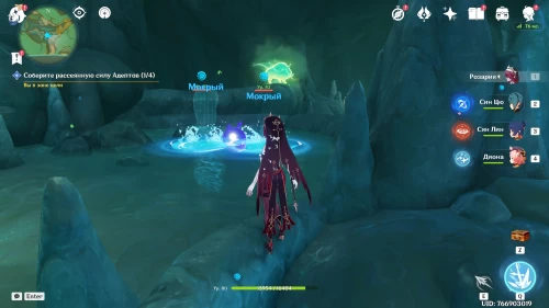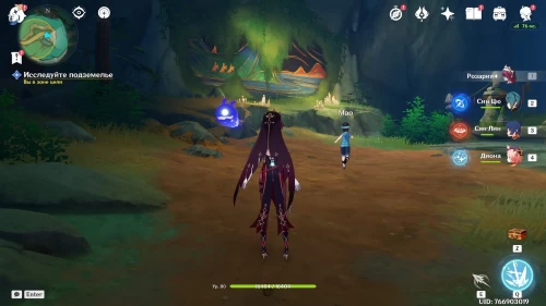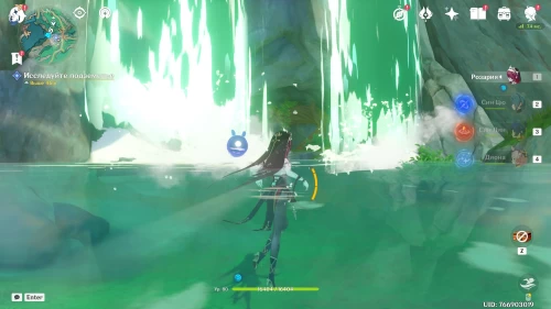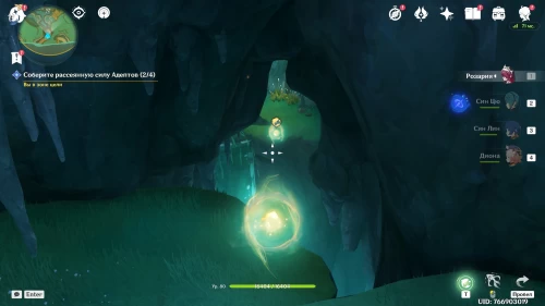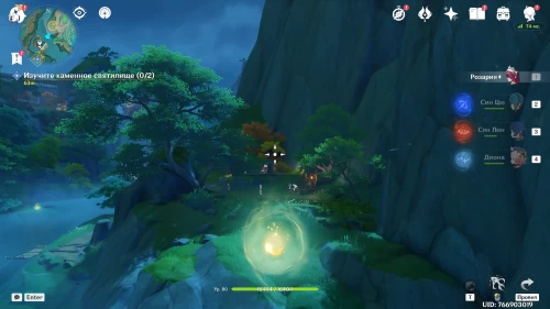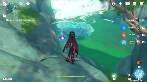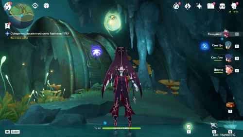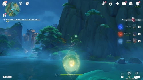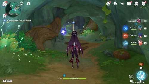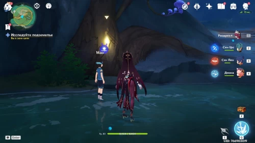 Запустите себя вверх, дабы перелететь через препятствие в другую часть пещеры. Бегите за кабаном, который вскоре превратится в мини-босса Фуюй, представляющего собой усиленного Гидро мимика. Несмотря на свой зеленый цвет, он имеет иммунитет только к Гидро атакам. При этом он все время имеет статус «Мокрый», поэтому вы сможете без проблем замораживать его Крио атаками.