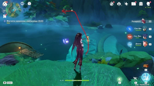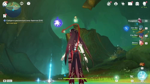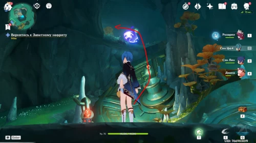 Начните следовать за парящей рыбой, активировав по пути телепортационную точку. Спрыгните вниз к Заветному нефриту и поболтайте с Фу Цзинь. Она попросит вас собрать силу Адептов, а потом встретиться с ней в условленном месте.
