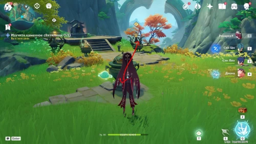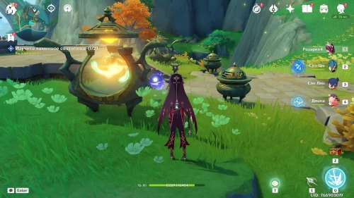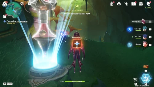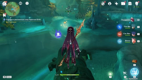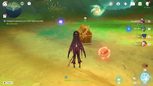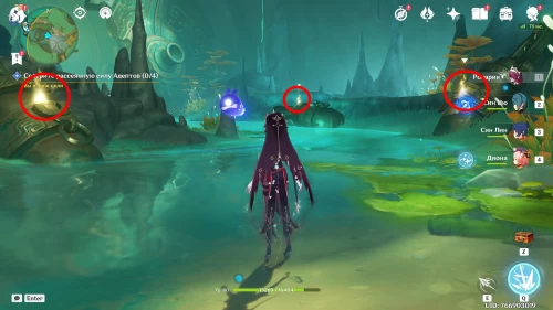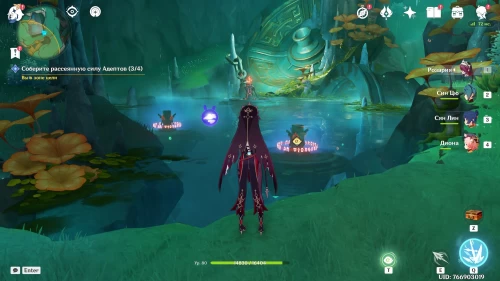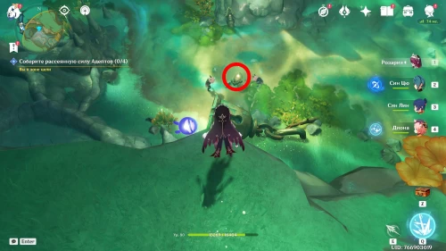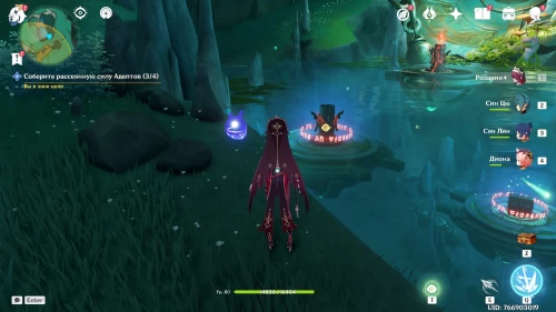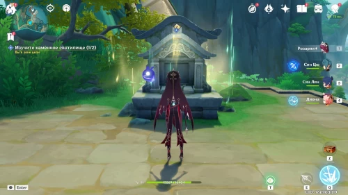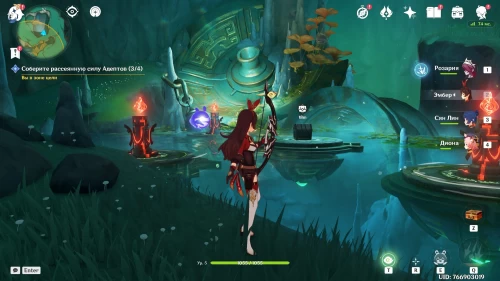 Теперь возьмите какого-нибудь Пиро персонажа, например, бесплатную Эмбер и быстренько зажгите данные монументы, пока они снова не опустились в воду – вы разблокируете богатый сундук и сможете получить последний сгусток энергии.
