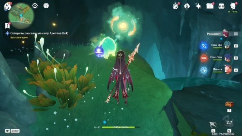 Далее осмотрите огоньки на трех других объектах чуть впереди. Когда вы соприкоснетесь с самым дальним из них, появится сгусток энергии – воздействуйте на него силой Адептов, чтобы собрать первую частицу энергии.
