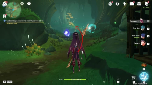 Затем пройдите ближе к центру отмеченной области, и вы увидите летающий здесь зеленый огонек. Приблизьтесь к нему, и он превратится в сгусток. Воздействуйте на него силой Адептов, и он трансформируется в зеленого кабана.